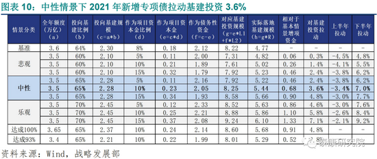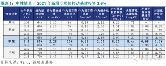 假设1:中性情景-2021年新增专项债投资3.5万亿,完成全年限额96%;悲观情景3.4万亿(达成93%),乐观情景3.65万亿(达成100%)。2020年基期为3.6万亿。