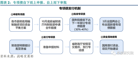 专项债实行限额管理,自下而上申报、自上而下审批。地方政府举债不得突破批准的限额,同时对专项债的资金用途也有明确要求。地方提前编制项目方案、向上申报额度,国务院在上年末提前下达部分专项债额度,并在当年两会审议公布全国新增专项债限额。分地区限额由财政部在全国人大或其常委会批准的地方政府债务规模内根据各地区债务风险、财力状况等因素测算并报国务院批准。额度下达后,相关项目准备申报材料,进入发债程序。