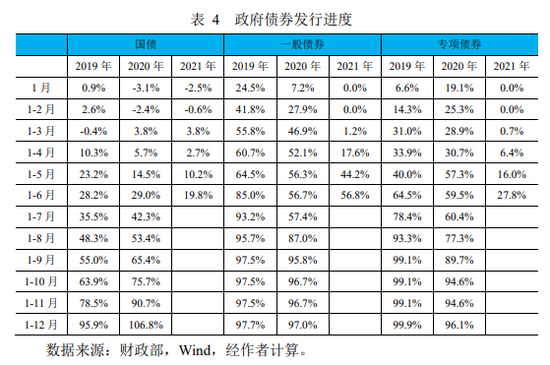今年以来,专项债券发行不仅慢于市场预期,而且慢于过去两年的发行进度。由于未提前下达额度,专项债券从 3 月才开始发行。3 月至 6 月,新增专项债券规模分别为 264 亿元、2056 亿元、3520 亿元和 4304 亿元,上半年累计发行 10143亿元,而 2019 年和 2020 年上半年分别累计发行为 13867 亿元和 22313 亿元。以实际新增规模除以全年计划新增限额来衡量发行进度,今年上半年专项债券发行进度为 27.8%,明显慢于 2019 年和 2020 年的 64.5%和 59.5%(见表4)。