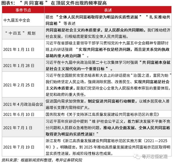 “共同富裕”长期存在于顶层规划和方针政策,始终存在于中国经济发展历程和脉络之中。改革开放以来的中国经济发展史,总结起来其实就是“让一部分人先富起来,先富带动后富,最终实现共同富裕”的前两句。但是“三次分配”正式进入党的文件是近年来内外部环境发生变化后的事情。