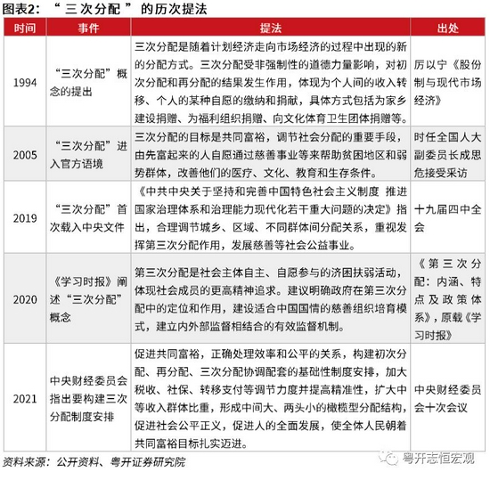 1994年厉以宁《股份制与现代市场经济》提出“三次分配”;2005年“三次分配”进入官方语境;2019年“三次分配”首次载入中央文件《中共中央关于坚持和完善中国特色社会主义制度,推进国家治理体系和治理能力现代化若干重大问题的决定》;2021年8月中央财经委员会第十次会议指出要构建三次分配制度安排。