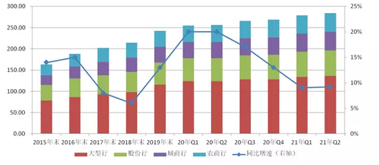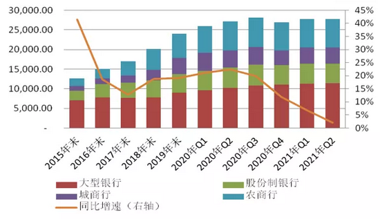 2021年二季度末,根据银保监会发布的监管指标数据,我国银行业金融机构本外币资产336万亿元,同比增长8.6%。其中,其中商业银行总资产281.3万亿元,较去年同期增长9.2%,占银行业金融机构比例的83.7%,占比和一季度持平。其中,大型银行本外币资产136.2万亿元,占比40.5%,资产总额同比增长8.1%;股份制商业银行本外币资产60.3万亿元,占比18.0%,资产总额同比增长8.4%。整个银行业资产仍保持较快速增长。