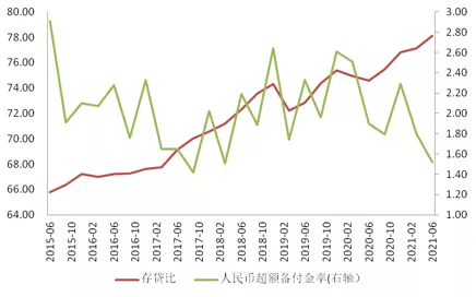 图8 商业银行整体超额备付金率与贷存比变化(单位:百分比)