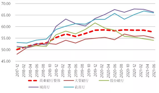 流动性比例。2021年6月末,流动性比例为57.62%,较上季末下降0.85个百分点,分银行类型来看,大型银行流动性比例上升0.8个百分点,略有上升,股份行下降4个百分点,城商行和农商行分别上升1个百分点和下降0.3个百分点,整体变化不大。