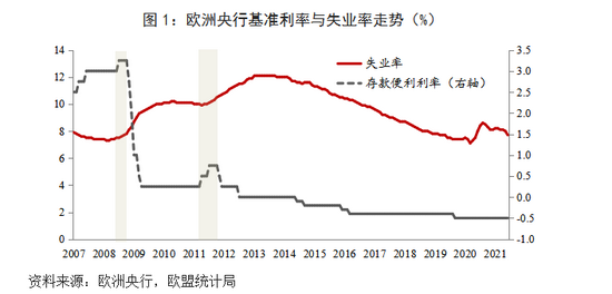 第三,欧洲央行吸取过早收紧货币政策的经验教训。历史上,欧洲央行曾两度面临类似情况。一是在2008年全球金融危机前夕,欧洲央行宣布加息。欧洲央行在2007年察觉到风险,向银行体系注入950亿欧元,但却在2008年危机正式爆发前几个月宣布加息,错失减轻危机损失的机会。随后,雷曼兄弟破产引发全球性金融海啸,欧元区不可避免地遭受严重冲击,欧洲央行不得不转为降息并推出3.3万亿欧元救助资金,支持金融稳定,刺激经济增长。二是在2011年欧债危机期间,欧洲央行过早收紧货币政策。2008年以来,欧洲主权债务不断膨胀,希腊拉开欧债危机序幕。尽管欧洲央行开始购买债券并维持1%指导利率,但其仍追求将目标通胀率控制在2%以下。2011年4月13日,欧洲央行决定将存款便利利率由0.25%提高到0.50%,并在7月再次加息至0.75%,致使欧洲主权债务风险进一步恶化,助推金融震荡、失业高企、经济衰退的严重后果(图1)。2011年11月,欧洲央行重新开始降息,并采取“一切必要的措施”来支撑经济。历经这两次危机,欧洲央行总结经验,吸取教训。在2021年7月议息会议上,行长拉加德表示,欧洲央行不会过早撤出紧急援助从而破坏当前的经济复苏。