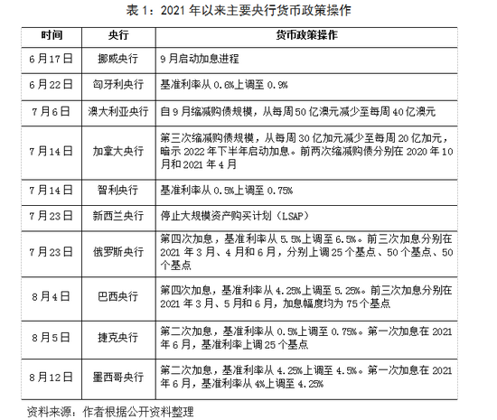 第二,市场对于欧洲央行货币政策转向的担忧加剧。2021年第二季度以来,全球货币政策转向预期不断升温。美国经济快速反弹,通胀水平显著抬升,长端国债收益率上行,逆回购工具使用量不断刷新历史纪录。近期,美联储上调超额准备金利率(IOER)和隔夜逆回购协议便利利率(ON RRP),持续释放讨论Taper信号。许多发达国家和新兴市场央行跟随放缓购债规模或提前启动加息操作(表1)。在此背景下,市场对于欧洲央行货币政策转向担忧情绪上升。7月22日议息会议前五个交易日,欧洲股市波动加剧,德国DAX指数、法国CAC40指数和意大利富时MIB指数一度下跌4.2%、4.0%和4.9%。直至欧洲央行释放鸽派信号,欧洲股市才快速呈现回升态势。