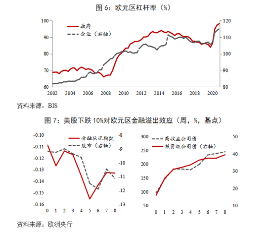 某种程度上,金融稳定是价格稳定的基础性条件,欧洲央行高度关注正在上升的金融稳定风险。一方面,欧元区在疫情期间积累了大量债务,企业与政府杠杆率创历史最高水平(图6);另一方面,投资者对于估值回落、资产价格下跌的担忧不断上升,非银金融机构存在脆弱性。此外,美联储货币政策正常化,将对欧元区金融稳定带来严重溢出效应。根据欧洲央行测算,如果美国经济改善状况不足以对冲政策收紧的负面效应,美股下跌10%,将导致欧元区股市下跌,公司债利率上升(图7),金融状况指数下跌超过10%,流动性收紧幅度约为2020年疫情冲击引发流动性紧缩的三分之一。