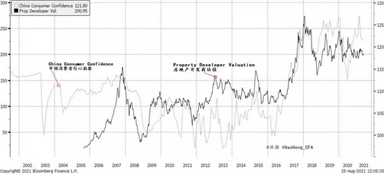 另外一种审视这一问题的方法是观察中国社会信心的变化,我们在这里以消费 者信心为代表,并将其与房地产业主和开发商的估值进行比较(图表 1)。