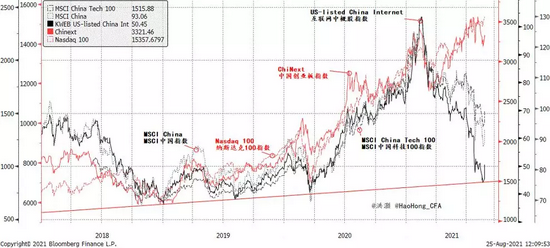 我们认为这个概念被外国投资者误解了。由于以在美国上市、在香港上市以及在A股上市的中国公司为代表的“中国市场”不止一个,我们可以通过对比这些不同公司群体的指数表现来判断那部分投资者对于“共同富裕”存在误解。
