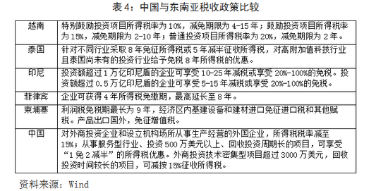 二是东南亚国家税收优惠政策优势凸显。越南、印尼、菲律宾等国对华招商力度不断加大,减免外资企业2-15年的所得税,并给予减税、进口设备免税和出口免增值税等优惠(表4),而外资企业在华所得税率为15%,普通国内企业面临相对较高的所得税率。截至2021年,国内企业一年所得税基本税率为25%,符合条件的小微企业税率20%,高新技术企业税率15%。世界银行报告显示,2016-2017年中国企业的总税费负担占利润的比重分别为68%和65%,高于东盟八国。