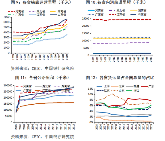第四,中西部地区基础设施条件正不断改善。其一,中西部交通运输条件与东部的差距在不断缩小。江苏、广东的内河航运里程占优,湖南、湖北、四川等中部省份内河航运也有一定规模(图10)。同时中西部地区的铁路、公路运营里程并不少于东部省份(图9、图11)。对比交通条件来看,得益于中西部高铁、航空运输快速发展,促进了电子制造业逐步打破沿海布局限制向内陆转移,例如郑州的富士康电子产品出口就是依托于郑州航空港和密集的铁路网络。其二,从电子通信条件来看,广东、江苏、浙江的移动电话交换容量、移动电话基站规模、光缆线路长度明显高于中西部地区。根据《中国宽带速率状况报告》,截至2020年6月,东部地区1000M及以上用户达155万户,占全国千兆用户总数的58.1%,东部地区5G基站总规模达26万个,占全国5G基站总规模的比重达63.4%。东部通信条件好与人口密集和经济发达有关,同时这一优势也更有利于发展信息科技和数字化产业。