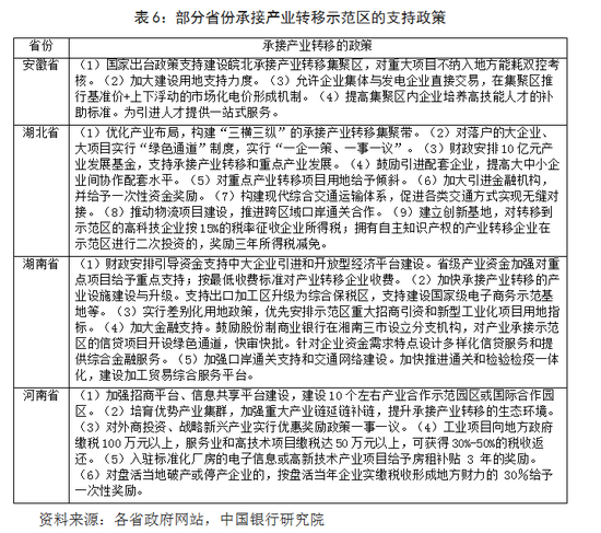 第三,中西部地区税收优惠和配套服务对产业转移的吸引力增加。近年来,中西部省份为加快承接产业转移出台了一系列扶持政策(表6),包括增加用地指标供应、提供税收优惠和安排专项产业资金、提升基础设施和公共服务水平、加大对承接产业的金融支持等。相比之下,东部地区建设用地指标紧张、财税优惠政策力度相对较小、市场空间相对饱和,不利于企业扩大投资和生产规模。不断升级的优惠政策进一步降低了企业生产经营成本,是产业向中西部地区转移的重要引力。
