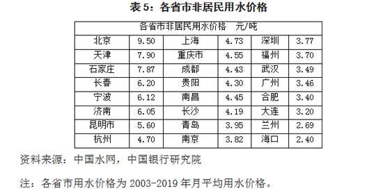 其三,中西部地区电价、水价总体较低。在东部发达地区中,上海、天津、浙江的大工业用电价格多数超过0.6元/千瓦时,其中1-10千伏的用电价格更是接近0.7元/千瓦时。相比之下,重庆、四川、贵州、江西、河南的大工业用电价格均低于东部发达省份,部分省份电价与东部相差超过0.1元(表4)。工业用水价格方面,天津、石家庄、济南等北方工业城市的水价大幅高于中西部城市,杭州、宁波、上海等工业发达城市的水价高于长沙、武汉、合肥、成都等中西部工业城市(表5),说明北方缺水工业城市和东部发达城市的水价明显高于中西部地区。