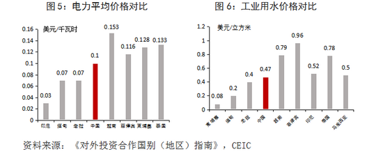 第四,东南亚国家在基础设施、水电价格和营商环境等方面落后于我国。其一,我国基础设施水平处于全球较高水平,相比之下,东南亚的铁路、公路、水运、人均电力装机容量和宽带普及率均处于劣势。比如,印尼国内交通设施落后、物流成本较高,导致本地部分农产品价格高于直接进口价格。菲律宾、老挝、缅甸电力供应严重不足、经常停电影响企业正常生产,因而需要从周边国家进口电力,但其输电损耗较大,造成电价总体偏高。2019年,泰国、越南、菲律宾电价分别为0.72元、0.53元和0.78元,除越南电价比我国主要发达省份低之外,泰国、菲律宾电价均高于我国东部地区(图5)。此外,东南亚工业用水价格普遍高于我国。2017年,中国平均水费为0.47美元/立方米,东盟八国中仅缅甸、柬埔寨、老挝用水价格低于中国,其余国家均高于中国,其中菲律宾的用水价格为0.96美元/立方米(图6),比中国工业水价高一倍多。