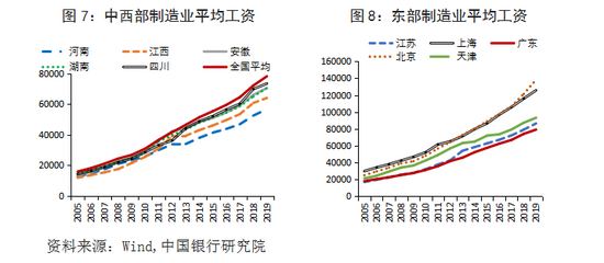 其二,中西部地区劳动力价格优势明显。2005-2019年,东部制造业职工年平均工资普遍上涨,但中西部工资上涨偏慢,承接产业转移较多省份的工资水平普遍低于全国平均水平。2019年,广东、上海的平均工资水平为9.88万元、14.93万元,山西、河南分别为6.95万元、6.72万元(图7)。单就制造业职工年平均收入而言,2019年北京、上海分别为13.8万元、12.5万元,江苏、浙江均超过8万元,而河南、江西、陕西分别为5.66万元、6.4万元和7.28万元(图8)。