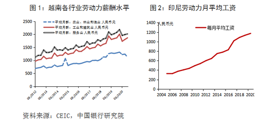 第二,东南亚劳动力优势突出,但劳动力素质存在不足。2019年,泰国、柬埔寨、菲律宾的最低工资水平分别为1667元、1285元和1637元。截至2020年末,越南服务业、工业的平均月薪分别为2016元、1867元人民币(图1);印尼每月最低工资水平约为1200元人民币(图2)。虽然东南亚国家劳动力工资明显低于我国(表3),但劳动力素质、技术熟练程度不及我国。截至2018年,越南、印度和中国15岁及以人口的识字率分别为95%、74.37%和96.84%。2010年至2020年,中国15岁及以上人口的平均受教育年限由9.08年提高至9.91年,文盲率由4.08%下降到2.67%。中国从事科技相关工作的人员数量已高达1.01亿人,连续七年蝉联世界第一位。