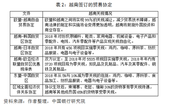第一,较好的区位和贸易环境是产业向东南亚国家转移的主要因素。一是海运交通条件便利。东南亚是太平洋与印度洋之间的“十字路口”,越南、印尼等国都拥有较多港口,并且靠近新加坡、便于进行转口贸易,也缩短了货物经马六甲海峡运往欧洲的里程。二是优惠政策较多。东盟较少受到发达国家的贸易打压,同时对外签订了大量自由贸易协议,数千种进出口商品的关税都降为0(表2)。其中,中国-东盟自贸区协定降低了双边贸易成本,便利企业向东南亚转移制造业和从中国进口原材料等。