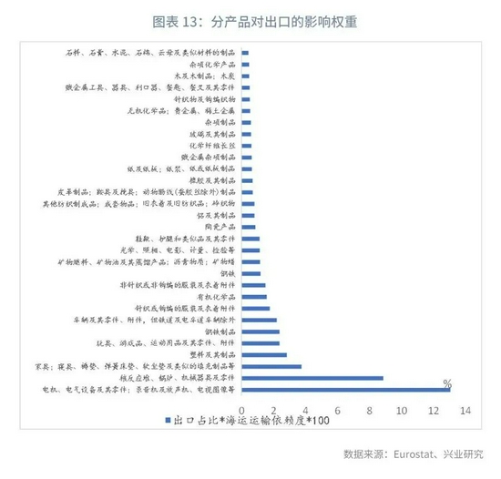 综上,各行业因出口产品特征及运输方式差异,运费上涨对其影响不一。据此,本文结合该行业出口权重及运输方式两个维度,分析运费上涨带来的压力。具体计算方式为:该行业出口权重与对海运出口依赖度比重的乘积,该指标越大,意味着运费上涨对该行业的影响在我国整体出口的权重越高。计算结果显示(参见图表13):