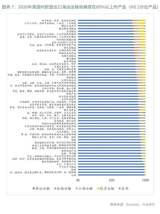 受集装箱短缺、港口拥堵、员工短缺等因素影响,海运运输不畅是运费上涨的主要矛盾。这或导致,高度依赖于海运运输方式的产品出口承受着更多的运费上涨之重。具体来看,在我国对欧盟出口中,以海运运输为主的商品主要有以下几类(参见图表7):