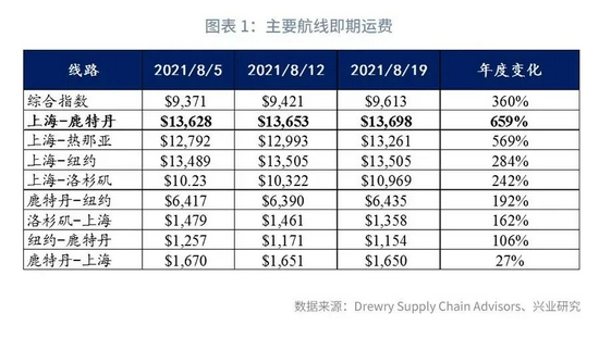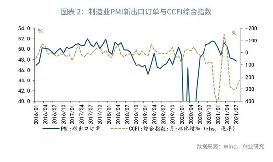 疫情爆发以来,供应链中断叠加全球需求不均衡分布,全球海运运费普遍上涨,由中国出发的航线涨幅位居前列。以上海至鹿特丹航线为例,截至2021年8月19日,该航线运价高达13698美元,为去年同期的6.6倍,参见图表1。运费上涨带来出口企业利润空间收窄,企业接单意愿下行进而导致新出口订单持续下行,参见图表2。那么,出口企业运输成本有多重?