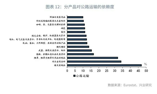 从公路运输来看,公路运输有机动灵活但运量小的特征。2020年,我国对欧盟出口的公路运输依赖度为9.3%。其中,约有46.9%的镍及其制品出口选择公路运输,随后依次为肉及食用杂碎,烟草、烟草及烟草代用品的制品,鞋靴、护腿和类似品及其零件,武器、弹药及其零件、附件,糖及糖食等产品,参见图表12。