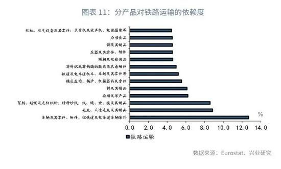 从铁路运输看,铁路运输具有速度快,运量大等特征。 2011年中欧班列开通以来,我国对欧盟出口铁路运输比重上升,由2011年0.5%趋势上升至2020年的4.2%,参见图表10。目前,对铁路运输依赖度超出平均水平的产品主要有:车辆及其零件,毛皮、人造毛皮及其制品,絮胎、毡呢及无纺织物,杂项化学产品,锌及其制品,铁道及电车道机车、车辆及其零件等,非针织或非钩编的服装及衣着附件等,参见图表11。不难看出,对铁路运输依赖度位居前列的产品,多为资本技术密集型和出口附加值相对较高的劳动密集型产品。