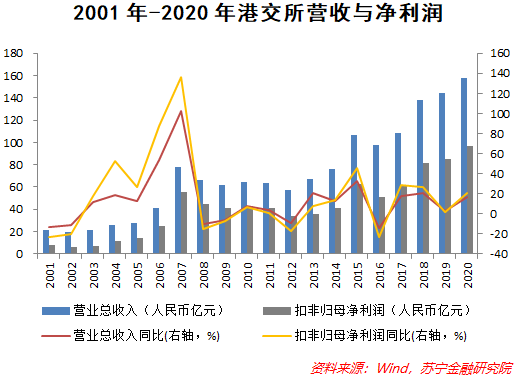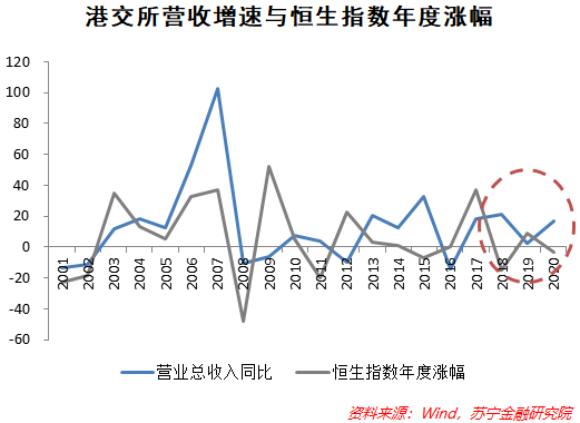 这其实也并不难解释,因为结算费用、年费等收入,很大程度上还是和证券市场的交易热情相关,而当资产尤其是权益资产价格上涨时,背后也对应着更大的证券购买和交易热情,因此2017年左右之前,港交所的营收增速与恒生指数的表现成明显正向关系,同时恒生指数还具有一些并不明显的领先性。