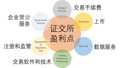 一个典型的交易所的业务主要包括交易手续费(或称交易费或结算费)、企业上市服务、注册和监管(包括会员年费等)、数据提供服务、交易软件和科技服务等。