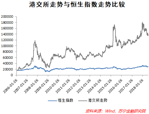 尽管港交所业绩在2017年的长时期内,与恒生指数表现为显著正相关关系,但从估值看,港交所的表现超出了自身业绩和恒生指数,并且这一差异很早就出现了。这背后可能很大程度上来自于港交所交易规模的积累。长期以来香港交易所越来越与大陆市场和资金紧密联系,由此获得了大量增量资产和资金,交易规模的空间也在持续打开。