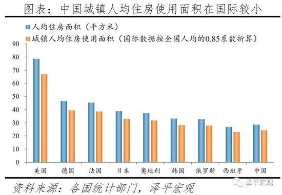 另一方面,中国家庭户规模迅速小型化,导致当今更多的住房和更大的人均住房面积需求。因生育率下滑、晚婚、不婚率和离婚率提高、寿命延长、人口流动等因素,家庭规模小型化是世界各国人口发展的普遍趋势。当前日本、美国、韩国家庭户均规模分别降至2.27、2.53、2.4人。中国家庭户均规模从1982年的4.41迅速降至2020年的2.62;家庭户规模缩小,主要是受我国人口流动日趋频繁和住房条件改善年轻人婚后独立居住等因素的影响。因此,如果以人均使用面积28平即人均建筑面积40平为标准算,未来中国城镇人均住房面积存在约13%的改善空间。