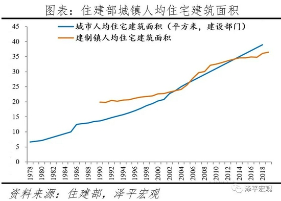 二是国家统计局公布的城镇人均住房建筑面积数据因抽样偏差可能存在高估。国家统计局基于约16万住户的全国城乡住户一体化调查公布人均住房建筑面积数据(2013年以前城镇住户调查和农村住户调查单独开展),2019年中国城镇、乡村人均住宅建筑面积分别39.8、48.9平方米。虽然住户调查理论上既包括家庭户,也包括集体户,但由于住户调查样本每五年轮换一次,需保证一定稳定性,实践中抽取样本多为当地有房户籍家庭,对流动性较大、居住空间较小的常住外来人口、少量居无定所的无房户覆盖不足,因此存在一定高估。此外,住建部依据地方逐级上报也统计有人均住房建筑面积,比如在《中国统计年鉴2008》公布1978-2006年城市人均情况,《中国城乡建设统计年鉴》公布1990年至今村镇人均情况,但县城和2007年之后的城市人均面积缺乏,这使得难以通过市县镇加总得出全国城镇住房存量。此外,住建部定义的“人均”以户籍人口+暂住人口为分母计算(2006年之前以户籍居住人口为分母计算),与一般的常住人均不同。