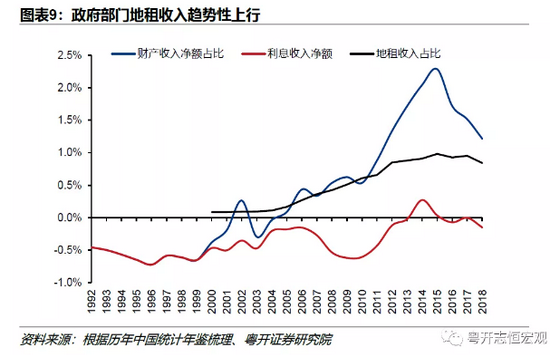 上述趋势反映到资金流量表中,就是政府部门财产收入中的土地租金项不断上涨。魏众(2014)研究指出,随着房地产的繁荣,土地租金占比趋势性上行,改变了政府利息收不抵支的局面,使得政府部门财产收入净额占国民收入比重由负转正(图表9)。2018年,中国政府部门财产收入净额占比为1.22%,仅地租收入占比就0.84%。作为比较,通过资金流量表计算的个人所得税占比为1.52%。