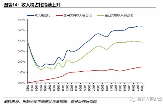 资金流量表数据显示,收入税占国民可支配收入比重在分税制改革前经历了短暂下降,自1995年后开始持续上行。与1995年相比,2018年收入税占比为5.38%,上升了3.87个百分点,其中70%以上由企业部门贡献(图表14)。