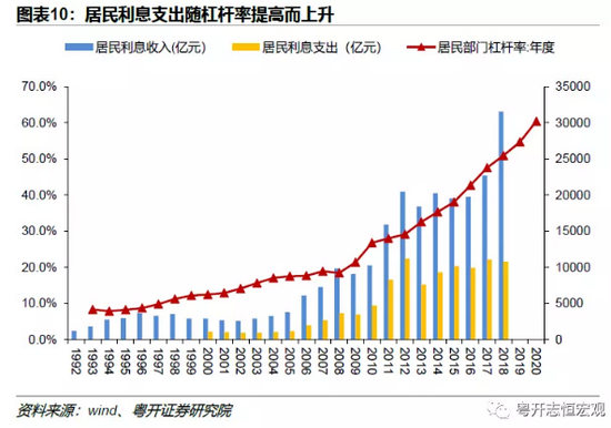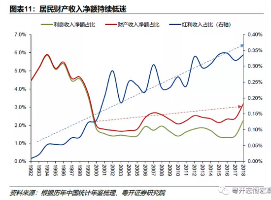 另一方面,房价高企导致居民部门杠杆率快速攀升,房贷挤压居民消费能力,导致居民剔除房贷后的可支配收入减少,同时利息支出持续上升,致使居民财政收入净额持续低迷。居民财产收入主要来自存款利息,虽然随着资本市场不断完善,居民其他投资渠道有所拓宽,但利息收入占财产收入的比重仍高达80%。过去居民收入的下降,主要由于亚洲金融危机后,利率不断下降。然而2000年后,红利收入不断提升,但居民财产收入依然持续低迷。背后原因在于住房贷款高增,加剧了利息支出,导致净利息收入低迷,拖累了财产收入净额的增长(图表10和图表11)。