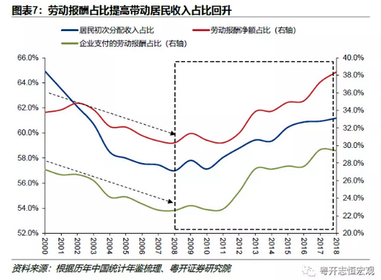 另一方面,2008年《劳动合同法》实施以来,企业用工更加规范,就业保障有所提高,加上机关事业单位工作人员养老保险改革,社会保险费不断提高,带动劳动报酬占比上升。2008-2018年,全社会实际保险费率由12.5%升至20.3% 。