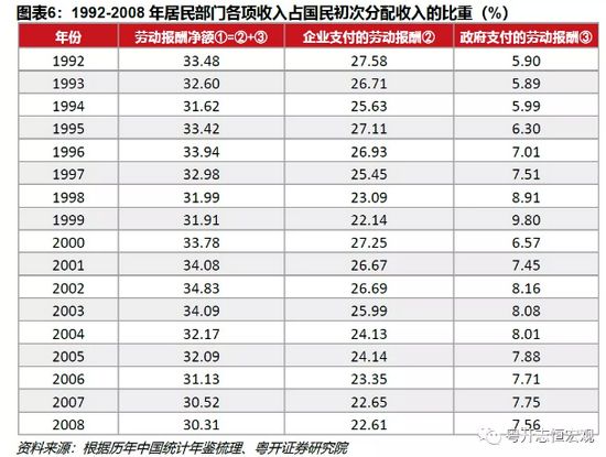 过去由于劳动力长期过剩,导致劳动报酬占比长期走低,带动居民收入占比下行,企业收入占比相应上行。1992-2008年,居民部门劳动报酬净额占比从33.48%降至30.31%,带动居民部门初次分配收入占比下滑至历史低点。进一步,居民劳动报酬净额来自政府和企业两部门,通过比较发现,政府支付的劳动报酬占比在上升,说明导致居民劳动报酬大幅下降的原因是企业支付劳动报酬占比的大幅下降,从27.58%降至22.61%(图表6)。由于压低了劳动报酬,企业部门营业盈余在这段时间走高,带动企业收入占比上升。这说明在中国经济转型初期,劳资双方存在事实上的不平等,劳动者较企业处于弱势地位,缺乏议价权。