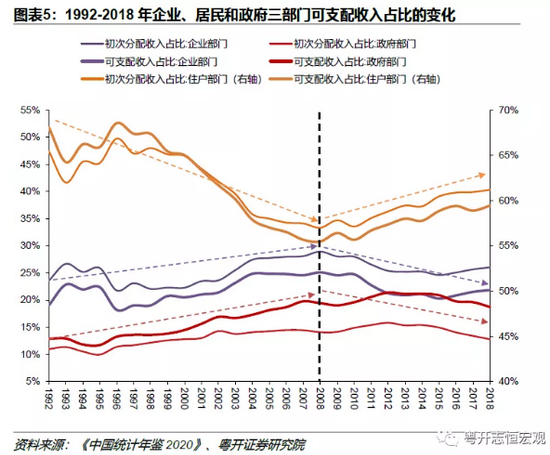 数据上进一步佐证了我们的判断,1992至2008年,居民部门初次分配收入占比从65.47%下降至历史低点56.99%,居民可支配收入占比从68.09%下降至55.48%,降幅超10个百分点;企业、政府无论初次分配还是再分配环节,其收入占比都在上升。2008年后,居民可支配收入回升,至2018年为59.43%,企业和政府占比则开始下降(图表5)。