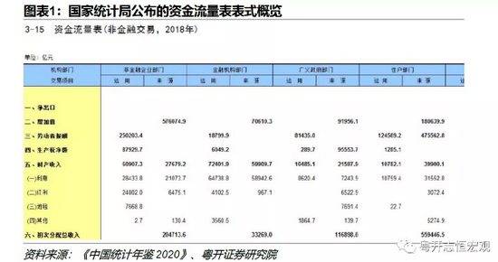 统计局公布的数据中,资金流量表是唯一直接报告三个部门收入的数据来源,是研究宏观收入分配最主要的工具。资金流量表采取标准式矩阵表,以机构部门为列,交易项目为行(图表1),每个机构部门之下分别列出“使用”与“来源”两栏,一个部门的收入,对应其他部门的支出。中国自1992年开始编制资金流量表,目前更新至2018年,时间跨度长,分项详尽。