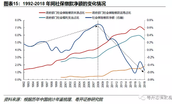 如前文所述,政府再分配环节中,收入税是在不断上涨的,但政府可支配收入占比却在波动下滑,尤其是2012年后,已经连续6年保持下滑状态。究其原因,主要由于社保覆盖面的拓宽,社保支出增加所致。我们将社保缴款和社保福利合并为社保缴款净额,如图表15所示,2008年以前社保缴款净额是上升的,反映出社保覆盖面有限,社保开支相对不足等问题,尤其是对于农民和城镇失业职工。而2008年后,随着新农合、新农保的推广以及城镇社保的规范完善,社保缴款净额开始逐渐下降。尤其是2013年后,社保缴款净额持续为负,说明当期的社保缴款已经无法覆盖社保福利的支出。