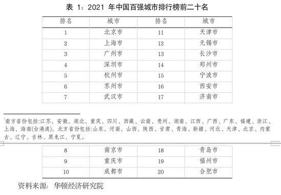 但需要注意的是,在东西差距缓解的同时,我国经济发展出现“南强北弱”现象,并且呈扩大化态势。北方地区GDP占比由2010年的42.81%降至2020年的35.22%,南方地区GDP占比则由 57.19%升至64.78%(图2)。另外,根据华顿经济研究院发布的2020年中国百强城市排行榜显示,百强城市前十名中北方城市仅有北京一家,前二十名中,北方城市仅有北京、天津、郑州、西安、济南和青岛五家(表1)。