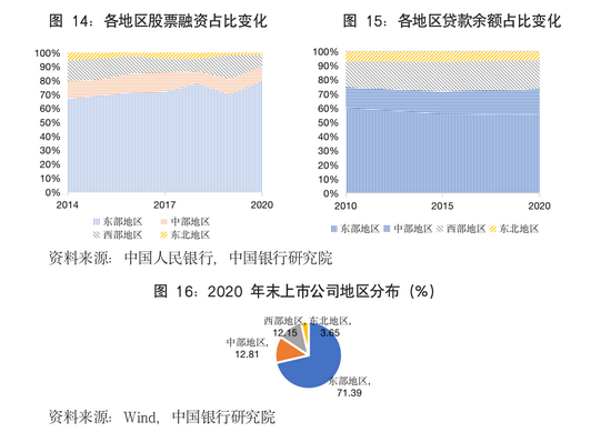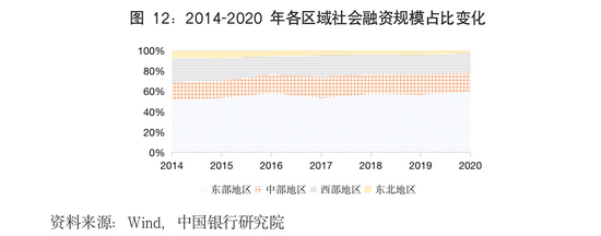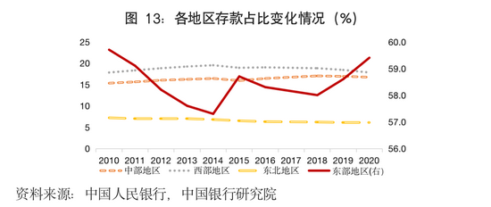 二是近年来东部地区融资总额占比大幅上升,存款也出现“东移”趋势,且明显高于GDP占比。近年来,经济产值的区域结构变化与融资结构变化并不同步。一方面,东部地区社会融资规模占比由2014年的51.15%增长至2020年的59.58%,提升了8.43个百分点,高于GDP占比7.65个百分点,西部、东北部社会融资规模占比则由24.1%和6.89%降至19.59%和2.32%,分别下降4.51和4.56个百分点,中部地区则由17.86%增长至18.51%,仅提高0.65个百分点(图12),中西部地区社融占比比GDP占比低近5个百分点。