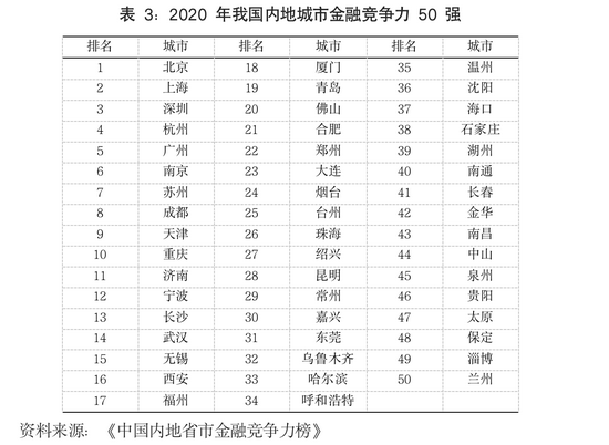 一是东部沿海地区金融资源集聚度较高。2020年,证券时报与新财富从经济竞争力、资本市场规模、金融机构实力和资本市场活跃度四大维度选取了29个指标,采用德尔菲、层次分析等专业分析法进行评价,评选并发布了内地城市金融竞争力50强。50强城市GDP总额占全国50%左右、上市公司总市值占比接近90%、金融机构本外币存贷款规模占60%以上、营业部交易额占全国近75%,金融竞争力优势凸显。但从区位看,50强城市分布存在明显的不均衡现象,多数城市集中在东南沿海地区,浙江、广东、江苏等省份上榜城市数量居前。具体看,东部城市占比超过60%,南方城市占比也在60%以上,东部、南方城市金融竞争力明显更强(表3)。