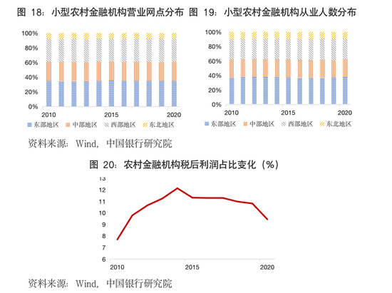 从各地区农村金融机构分布情况看,东、中、西部地区小型农村金融机构营业网点数大体维持在35%、25%和20%左右,从业人员人数占比大体保持在37%、25%和28%左右,东北地区则分别下降了1.5、0.5个百分点,维持在7.5%、9.2%左右,没有明显变化(图18、图19)。此外,我国主要农村金融机构税后利润占银行业金融机构占比由2010年的7.69%提升至2014年的12.12%,随后一路降至2020年的9.44%,盈利能力下降明显,普惠金融业务的商业可持续性面临一定挑战(图20)。