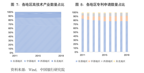 从科技投入规模看,东部地区要明显领先于其他地区。东部地区科技投入强度(R&D经费与GDP之比)由2007年的1.76%提升至2019年的2.8%,增长超过1个百分点,高于中部、西部和东北地区的0.8、0.37和0.33个百分点(图5);东部地区R&D成果及科研人员占比由2010年的51.3%提升至2019年的53.76%,提高2.46个百分点,中部地区提升近3个百分点,西部地区则大幅下降5.12个百分点(图6)。高科技产业数量方面,中部地区增长态势明显,占比由2011年的14.49%增长至2019年的19.15%,增长4.66个百分点,东部地区则下降了4.36个百分点,但占比仍然高达66.24%(图7)。专利申请数量方面,中部地区也显示出较大潜力,占比由2011年的8.46%提升至13.64%,虽然东部地区占比下降了6.15个百分点,但占比仍然超过四分之三,西部地区提高1.87个百分点,东北地区则下降了0.9个百分点(图8)。
