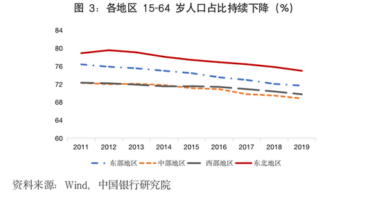 一方面,各区域劳动力人口数量占比持续下滑。近年来,我国各地区人口老龄化现象均有所加剧,适龄劳动力人口出现持续下降。东部、中部、西部、东北地区15-64人口占比由2011年的76.4%、72.29%、72.32%、78.88%降至2019年的71.67%、68.82%、69.75%、74.97%,分别下降 4.72、3.47、2.57、3.91个百分点,尤其东部地区降幅最大(图3)。整体来看,我国各地区劳动力成本优势出现不同程度下降,人口红利驱动经济增长的作用在衰减。