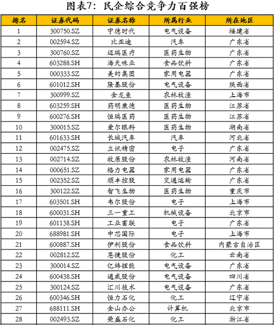 对民营A股上市公司的十项指标进行降维分析并合成出民营经济竞争力指标,形成了A股民营上市公司综合竞争力排名百强榜。根据我们对两千余家民营A股上市公司的十项指标进行因子分析结果,我们将十项指标进行降维,形成四大因子——即企业规模因子(市值、资产、营收)、盈利能力因子(ROE、净利润率)、增长能力因子(总资产增长率、营收增长率、净利润增长率)、创新能力因子(研究生人数占比、研发费用占比)。并对四大因子根据其总方差贡献率进行加权合成为一项综合竞争力指数,根据综合竞争力指数大小排名,即可得出了民营企业综合竞争力百强榜单。A股综合竞争力前十强民企分别为:宁德时代、比亚迪、迈瑞医疗、海天味业、美的集团、隆基股份、金龙鱼、药明康德、恒瑞医药、爱尔眼科。从排名结果可以看出,受益于四大因子定义,大规模、高增长、高科技企业脱颖而出。