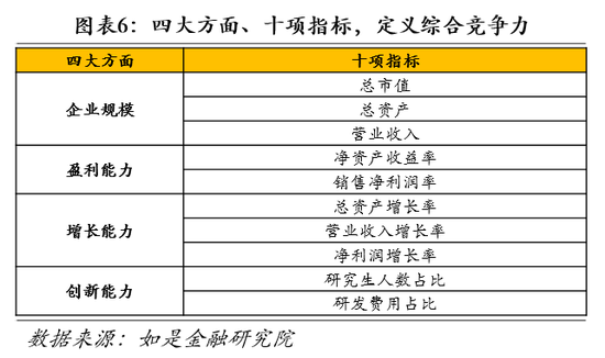 受制于数据获取难度,本次排名仅涉及A股民营上市公司,并通过十大指标定义上市公司综合竞争力。在样本选取上,由于我国民营企业数量之众多、分布之广阔,相关企业样本与财务数据难以穷尽,加之非公众公司财务数据难以获取,本次研究主要使用Wind数据库与同花顺iFinD数据库中A股上市公司数据。选取民营企业样本范围仅覆盖A股上市公司。在数据获取时我们选择了iFinD数据库中两千余家非国有控股企业的2021年中期财务报告,剔除了ST公司、*ST公司以及报告期未上市公司进行研究。在财务指标的选取上,我们选择十大指标,即总市值、总资产、营业收入、净资产收益率、销售净利润率、总资产增长率、营业收入增长率、净利润增长率、员工研究生人数占比、研发费用占营业收入比例,来定义民营企业的“综合竞争力”。根据因子分析降维结果,十大指标共合成为四大因子,根据总方差贡献值我们将四大因子简单定义为企业规模因子(总市值、总资产、营业收入三指标合成)、盈利能力因子(净资产收益率、销售净利润率两指标合成)、增长能力因子(总资产增长率、营业收入增长率、净利润增长率三指标合成)、创新能力因子(员工研究生人数占比、研发费用占营业收入比例两指标合成)。