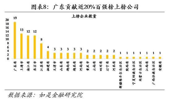 (1)我国经济第一大省广东上榜企业最多,贡献近20%上榜企业