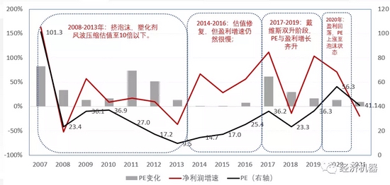 3)2017-2019年:提价成功,盈利兑现,带动了戴维斯双升。期间,股价上涨270%,但由于盈利高增长,PE估值从25倍上升到36倍;