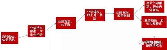 一般来说,周期底部,盈利低点,PE/PB估值处于极低水平(对周期股而言,也可能高PE/低PB)。此时,一旦自下而上出现业绩拐点信号,PE/PB估值会率先上升;而后,业绩释放,PE出现大幅下降。如果业绩进一步爆发,盈利增速显著高于趋势增长水平。就会出现“戴维斯双击”,股价暴涨。随后,如果业绩兑现,同时明年业绩回到趋势增长水平,则估值会向合理水平调整,股价出现回落。此后,如果高景气被证明仍可持续,则股价有望再创新高,估值再次提升;反之,如果业绩随后出现放缓,股价有望大幅修正。一旦周期拐点确认,则会出现猛烈的杀估值现象(图3),即所谓“戴维斯双杀”(图)。当然,周期波动并非是围绕不变中枢的简单轮回,更可能是波动中枢缓慢抬升。